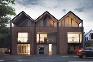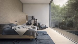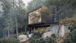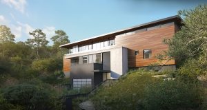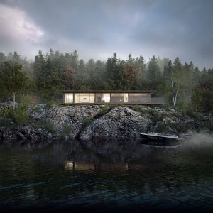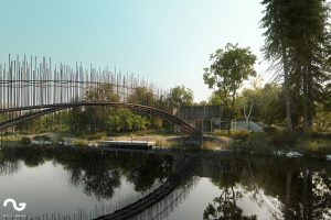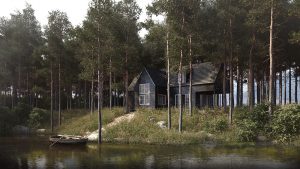 A rendering of house near a river with pedestrian bridge crossing a river in front [...]