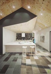 A scandinavian themed house with kitchen. Vizpark Plywood Panels are used in this scene
